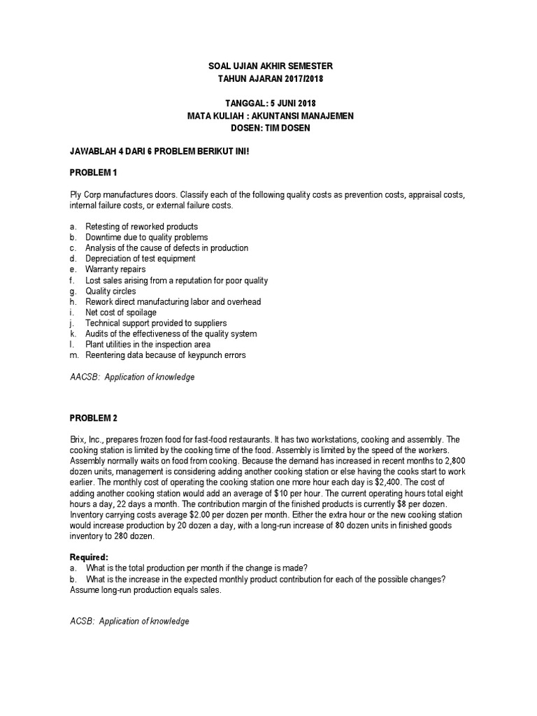 Contoh soal dan jawaban uas akuntansi manajemen. Apabila seorang pengusaha menggunakan uangnya untuk membeli bahan dan tidak jadi di depositokan maka pengeluaran tersebut disebut. Kali ini saya ingin membahas pertanyaan dari sahabat akuntansi yang beberapa waktu lalu mengirimkan pertanyaannya di form komentar blog akuntansi itu mudah. 9 contoh soal akuntansi manajemen dan kunci jawabannyai manajemen akan mempermudah untuk memahami peran tujuan dan makna akuntansi manajemen bagi perusahaan terutama bagi pihak internal perusahaan.